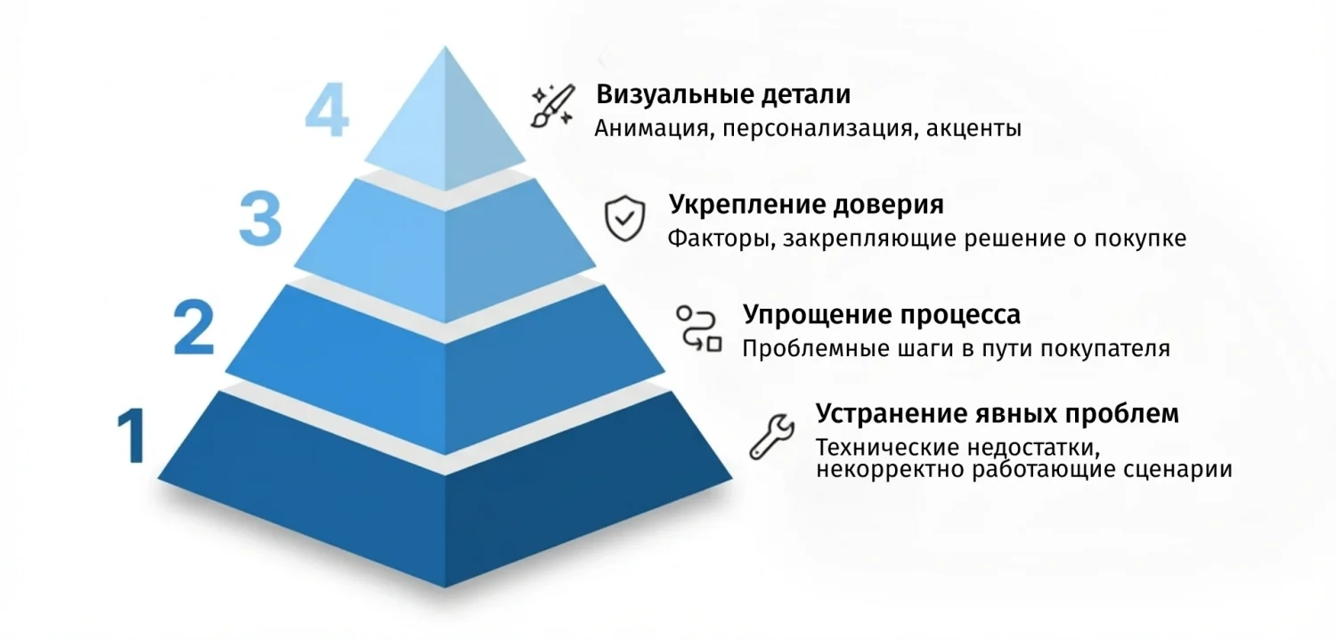 Такой порядок защищает от типичной ошибки: тратить бюджет на «вау‑эффекты», когда главные потери происходят на скорости или финальном шаге оплаты.