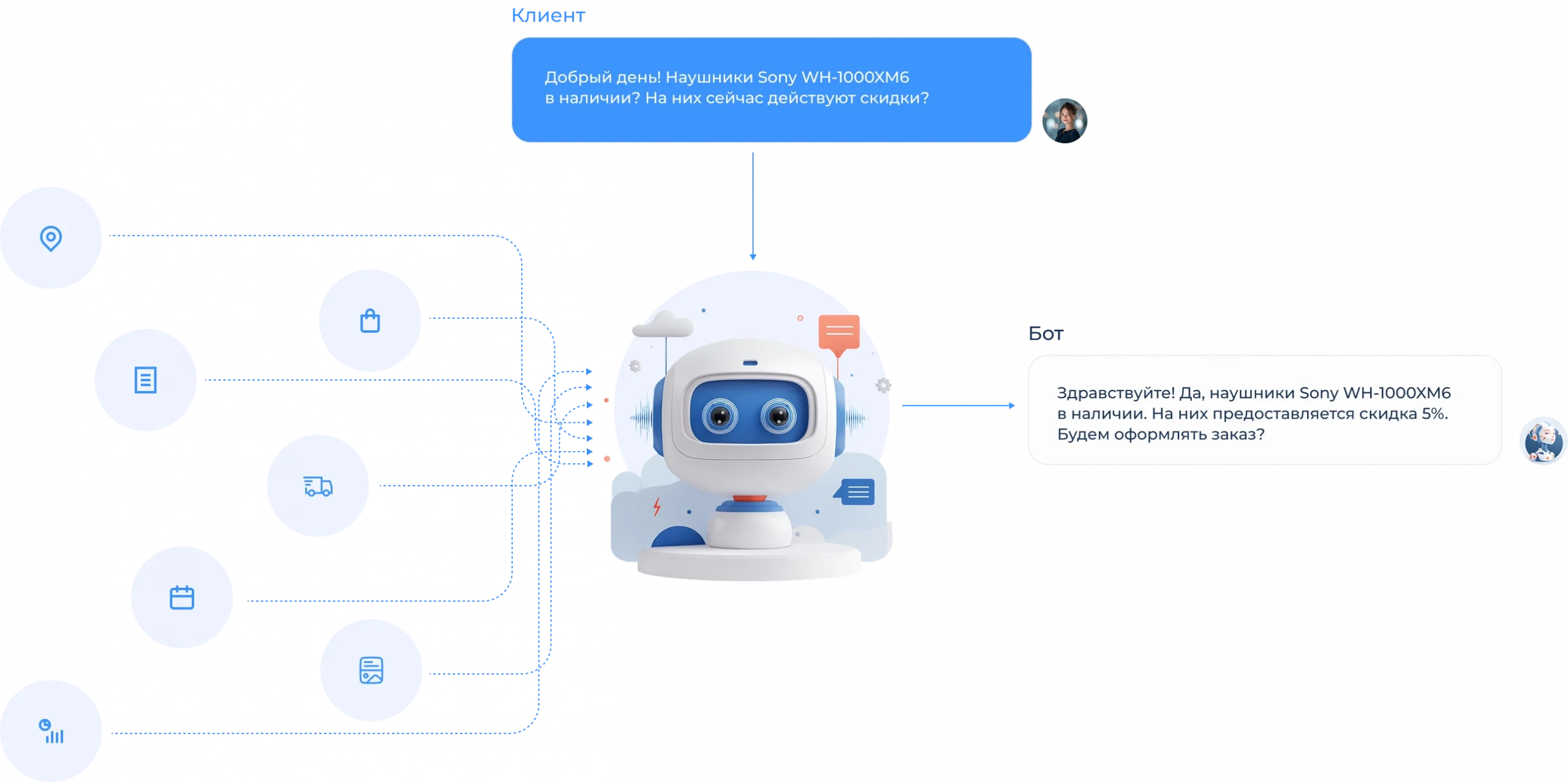 - Автоматизирует ответы на часто задаваемые вопросы — статусы заказов, способы оплаты, пункты выдачи.